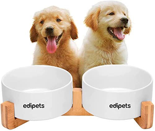 Edipets, Comedero Perro Gato, 400, 800 y 1900 ml, Cerámica, Individual y Doble, Soporte de Bambú Antideslizante, Pequeño Mediano y Grande, 5 Colores (Doble Pequeño, Blanco)