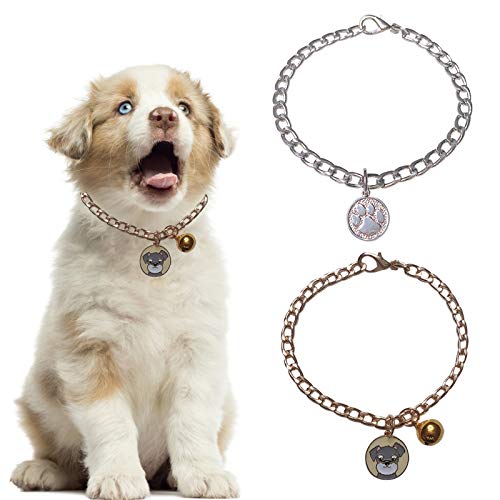 HACRAHO Collar de cadena para perro, 2 unidades de collar de metal ajustable para perro, collar de cadena con campana y colgante para perros pequeños, gatos, oro y plata, 35 cm